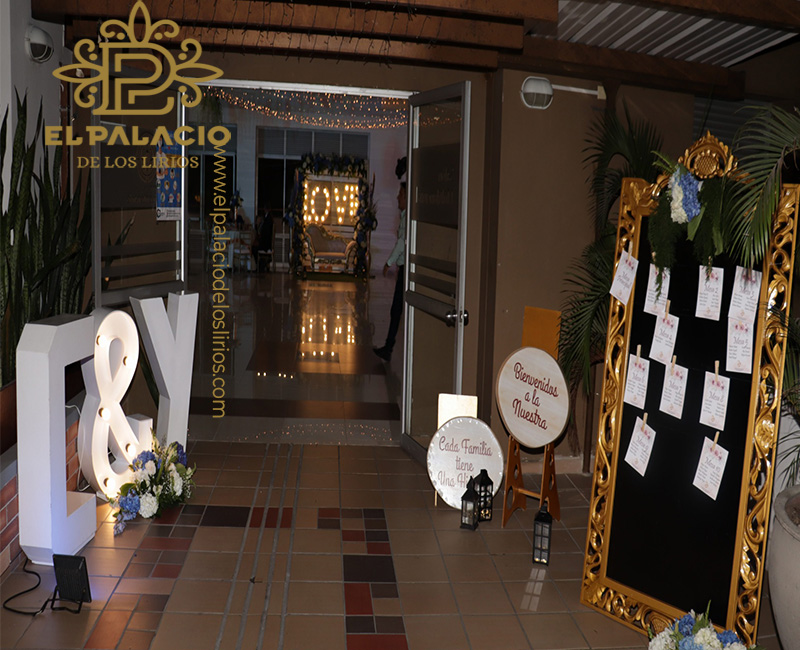 Iniciales de novios en luz, marco de enumeracion y 2 ascesorios con mensajes