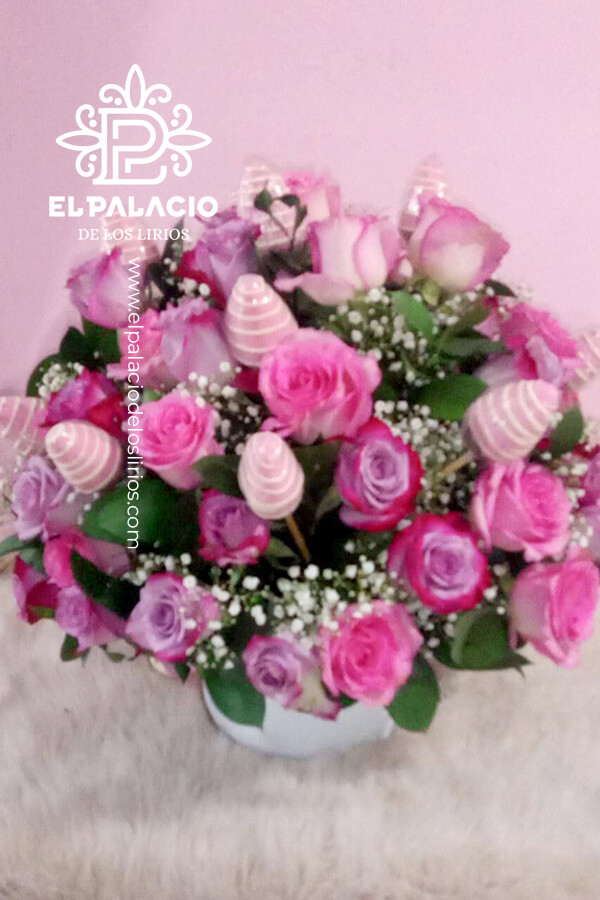 Hermosa arreglo de rosas lilas y rosadas con una dulce decoración de fresas bañadas en chocolate blanco.