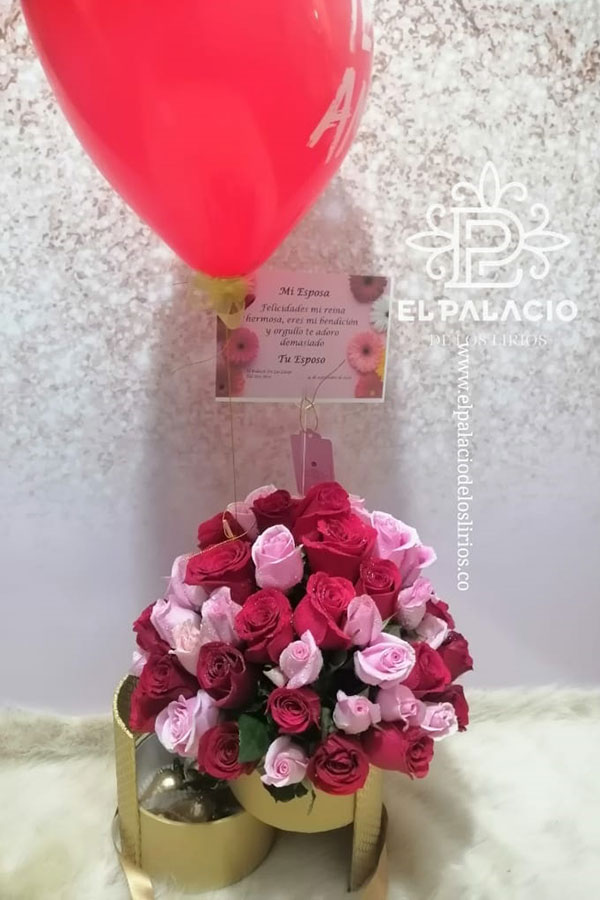 Vive intensamente el amor y dale esta bella sorpresa a tu pareja. Caja de rosas rojas y rosadas con globo decorativo y tarjeta. Le encantará