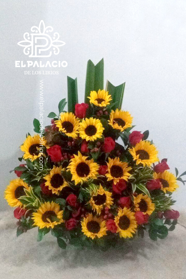 Tremendo y Hermoso, arreglo de girasoles con rosas rojas y caramelos, estilo tropical decorado con moño y mensaje especial.