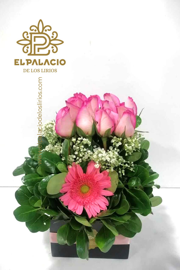 Arreglo de rosas rosadas y gipsófila con follaje verde.