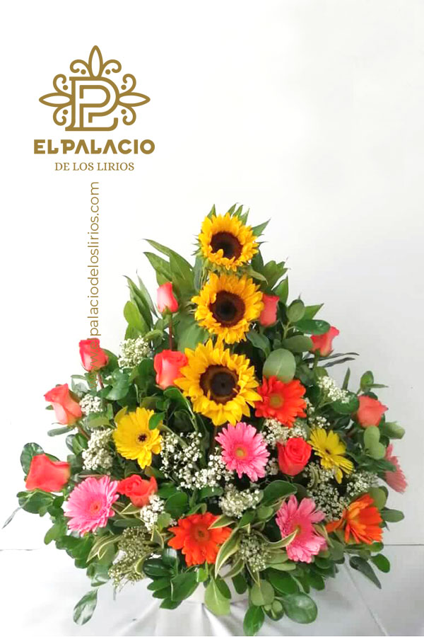 Hermoso arreglo en forma de pirámide con rosas, margaritas y girasoles. Un buen regalo para sorprender a ese ser querido.