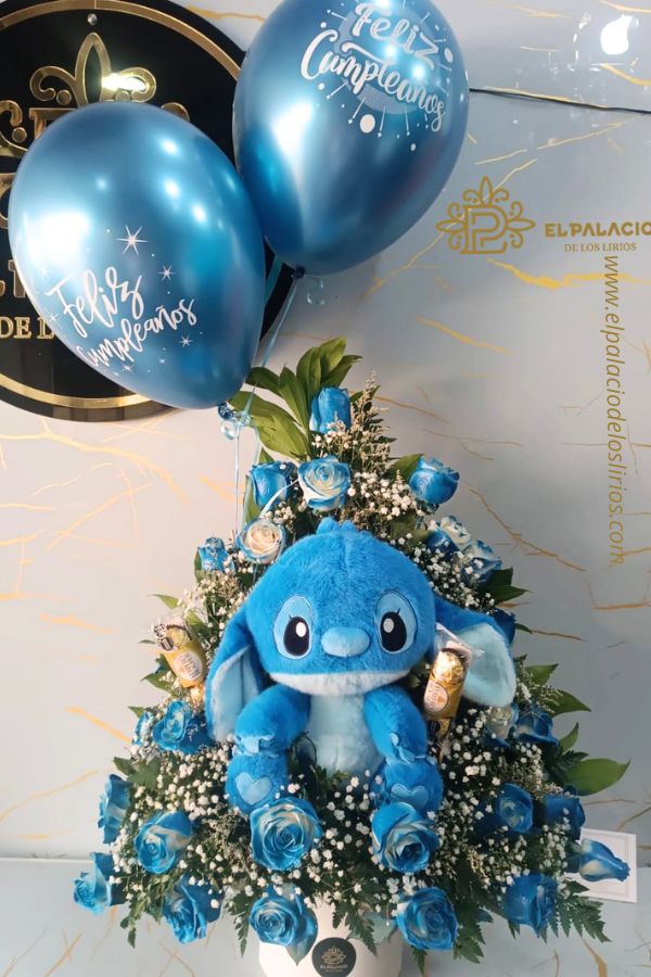 Un encantador arreglo de 24 rosas azules, acompañadas de follaje fresco, un adorable oso Stitch azul y globos en helio que elevan la celebración. Perfecto para cumpleaños o cualquier ocasión especial, este diseño transmite magia, alegría y un toque de fantasía.
