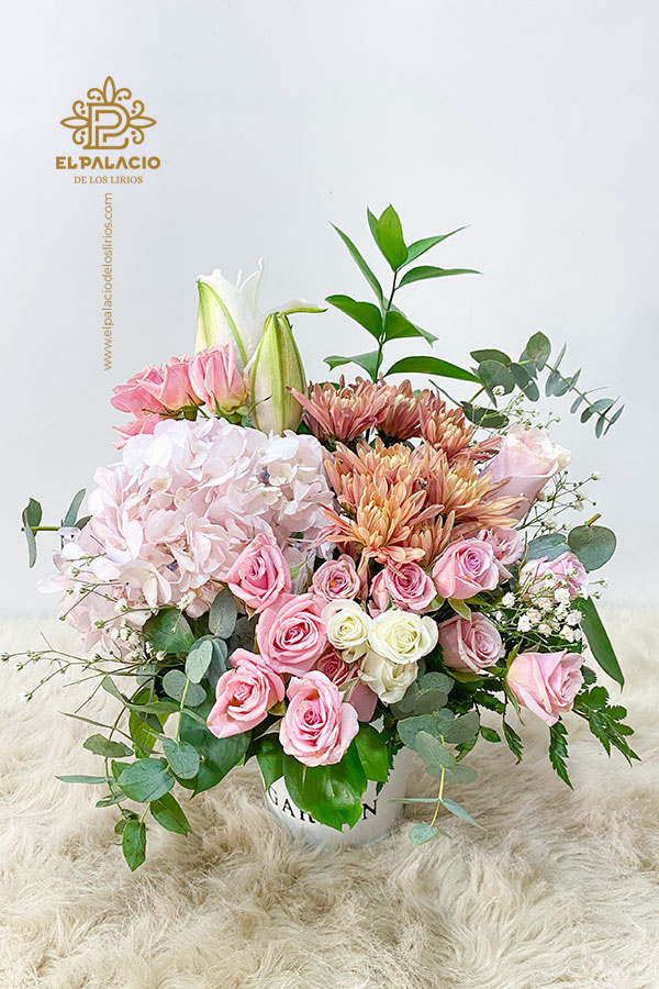 Hermoso arreglo de base con rosas, lirios y follaje.