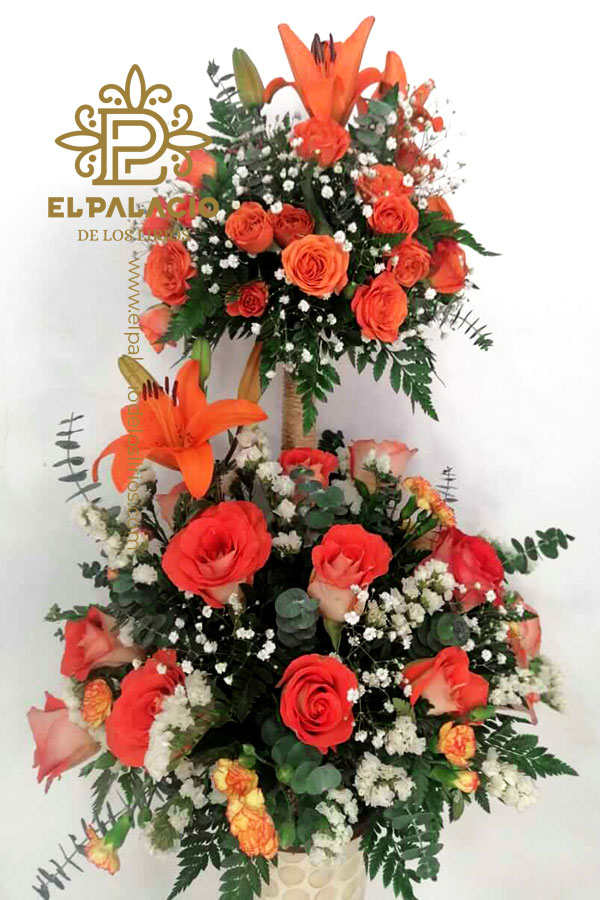 Arreglo tropical de rosas naranja y azucenas con toques de gipsófila y follaje verde y decorado con chocolates y tarjeta.