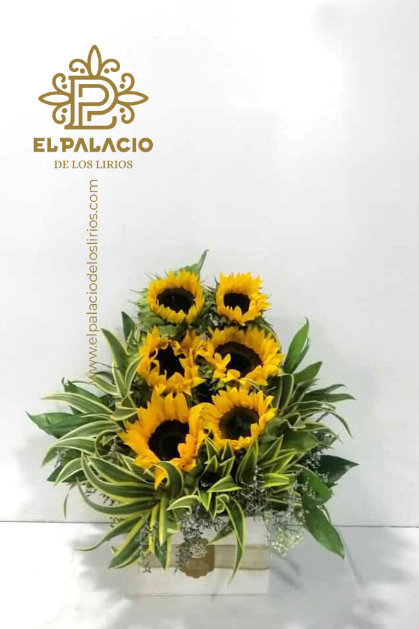 Arreglo de girasoles con exótico follaje verde.