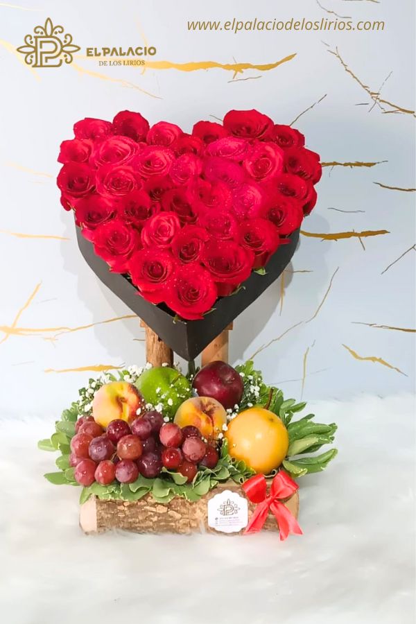 Sorprende a mamá con este extraordinario regalo que combina la pasión de 50 rosas rojas en forma de corazón con la frescura y dulzura de frutas seleccionadas como uvas, manzana, pera, durazno y granadilla. Un detalle único que une la belleza floral y los sabores naturales para expresar todo tu amor y gratitud.