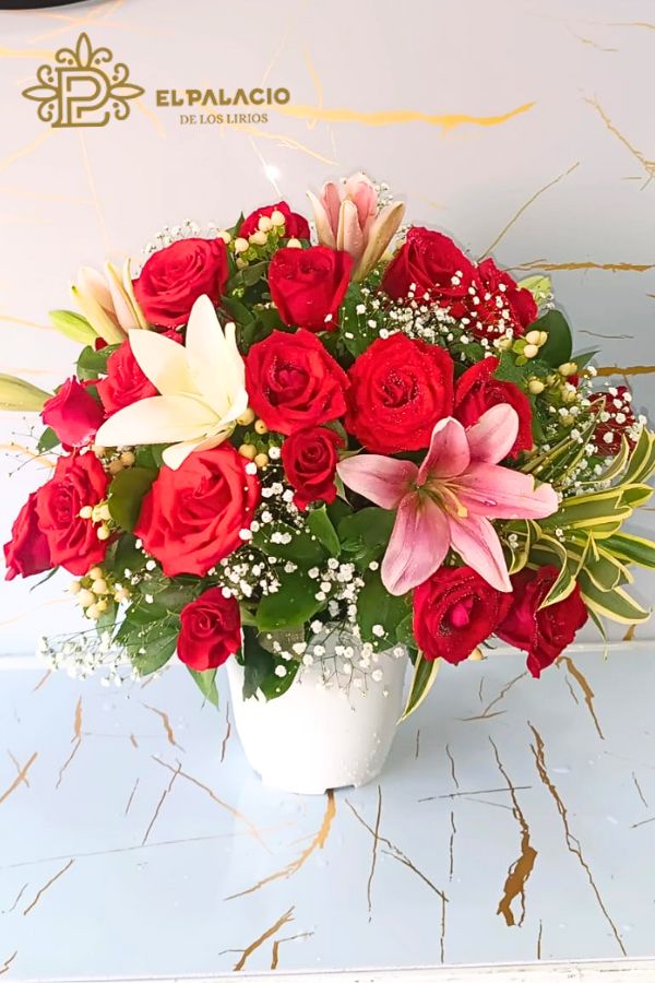 Este majestuoso arreglo combina la elegancia de 24 rosas, la delicadeza de 5 lirios, la suavidad de la Gipsofilia y el encanto exótico de la Canción de la India, todo complementado con follaje fresco. Perfecto para celebrar el Día de la Madre o cualquier ocasión especial, este diseño es una verdadera obra de arte floral que ilumina cualquier espacio con su belleza y armonía.