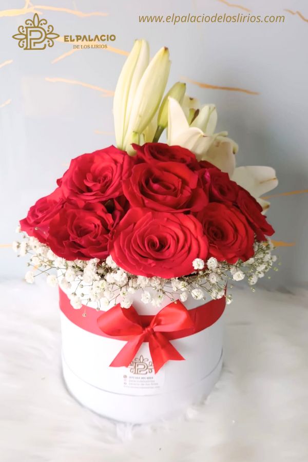 Un elegante box floral con rosas rojas y lirios, cuidadosamente dispuestos en una caja sofisticada que resalta su belleza y significado. Las rosas rojas expresan amor y pasión, mientras que los lirios aportan pureza y distinción. Perfecto para sorprender en ocasiones especiales y transmitir emociones profundas con un toque de lujo.