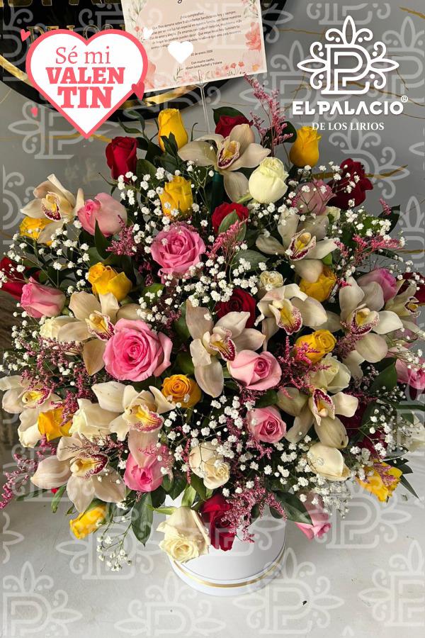 Arreglo floral premium en base elegante, compuesto por rosas rosadas, rojas, amarillas y blancas, finas orquídeas, follajes verdes y delicados toques de gypsophila.