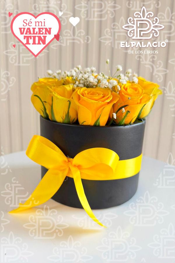 Sombrerera negra premium con rosas amarillas y delicados detalles de gypsophila, decorada con cinta satinada amarilla. Un diseño moderno y vibrante que simboliza alegría, energía y amor luminoso.