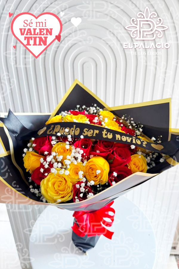 Ramo impactante en tonos rojo y amarillo con rosas frescas y detalles delicados, envuelto en papel negro elegante y cinta roja. Incluye mensaje especial “¿Puedo ser tu novio?”, ideal para una propuesta inolvidable.