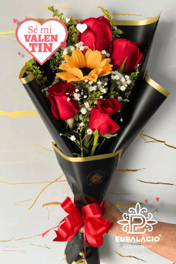 Cuatro (4)rosas premium y un hermoso girasol