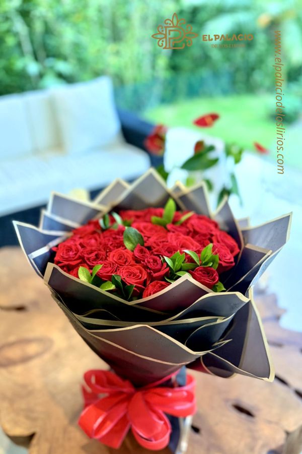 Un impresionante arreglo con 50 rosas rojas premium, acompañado de rusco fresco, envuelto en papel coreano de alta calidad y adornado con un gigante y elegante moño. Este diseño sofisticado es perfecto para expresar amor y distinción en cualquier ocasión especial.