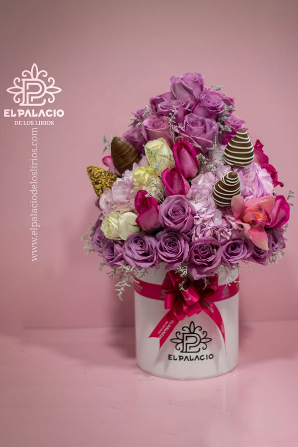 Hermosa creación que combina la ternura de las flores y la dulzura natural de las fresas con chocolate, diseño montado sobre base cilíndrica con cinta decorativa y tarjeta con mensaje especial.